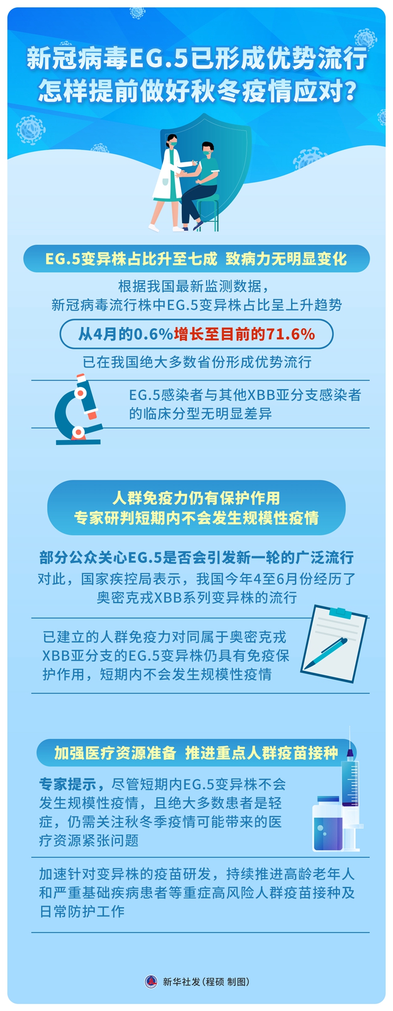專(zhuān)家提示,盡管短期內(nèi)EG.5變異株不會(huì)發(fā)生規(guī)模性疫情,且絕大多數(shù)患者是輕癥,仍需關(guān)注秋冬季疫情可能帶來(lái)的醫(yī)療資源緊張問(wèn)題,加速針對(duì)變異株的疫苗研發(fā),持續(xù)推進(jìn)高齡老年人和嚴(yán)重基礎(chǔ)