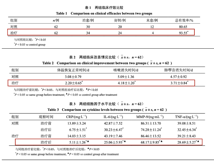(數(shù)據(jù)來源:中國人民解放軍第306醫(yī)院李俊梅、鄭成中團(tuán)隊《小兒肺熱咳喘口服液聯(lián)合奧司他韋治療小兒病毒性肺炎的臨床研究》)