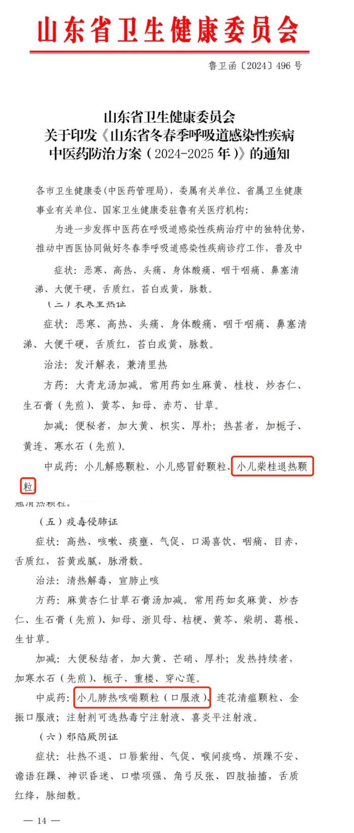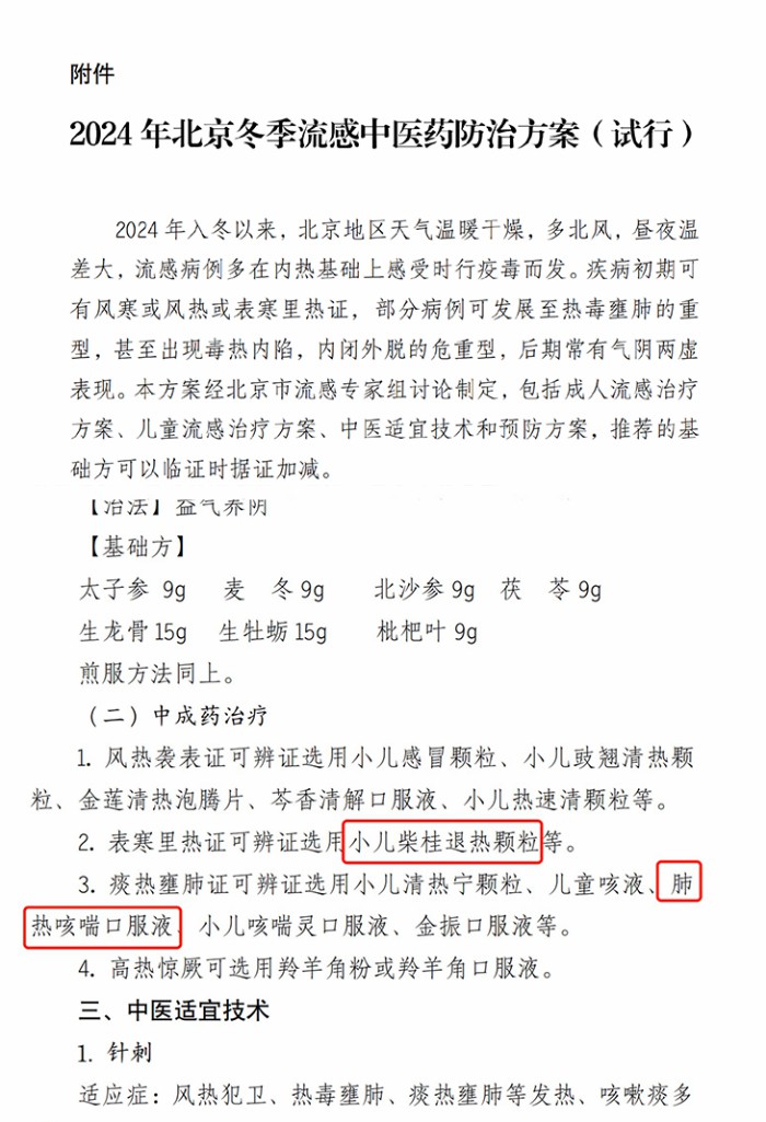 此外,在今年山東省衛(wèi)健委發(fā)布的《山東省冬春季呼吸道感染性疾病中 醫(yī)藥防治方案(2024~2025年)》、北京市流感專家組制定的《2024年北京市冬季流感 中醫(yī)藥防治方案(試行)》等多省流感方案,也推薦可辨證選用小兒肺熱咳喘口服液、小兒柴桂退熱顆粒等中成藥。