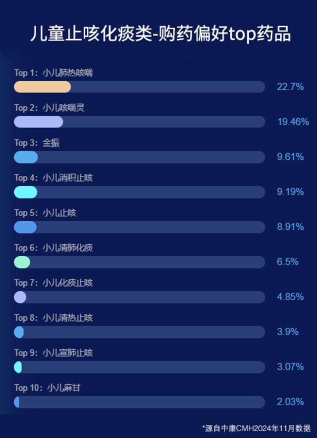 流感高發(fā)帶動了兒童抗感 藥品市場的活躍。中康CMH數(shù)據(jù)顯示,2024年11月以來,兒童止咳化痰類購藥偏好中,小兒肺熱咳喘以22.7%的占比位列TOP1,這一數(shù)據(jù)充分證明了其在緩解兒童流感癥狀、促進(jìn)康復(fù)方面的獨特優(yōu)勢,獲得市場、家長的認(rèn)可。