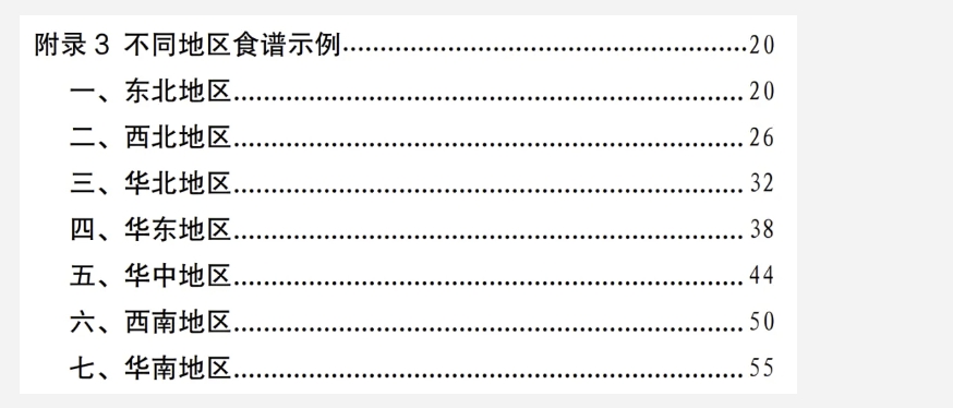 值得注意的是,這份食譜細(xì)化到了全國(guó)不同地區(qū)的食譜示例,并備注了食譜的“總能量”。